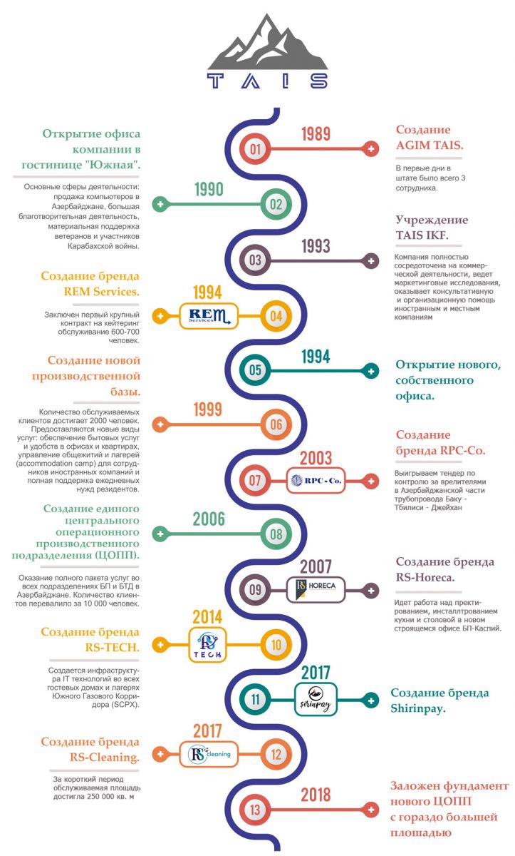 Основанная в 1989 году, компания AGİM TAİŞ начала заниматься предпринимательской деятельностью, чтобы максимально использовать возможности, создаваемые рыночной экономикой. Компания была одним из первых местных предприятий, которая сосредоточилась на предоставлении услуг общественного питания для сотрудников, работающих в офисных комплексах в Баку. Наша способность обеспечивать стабильное качество, эффективные и оперативные услуги позволила нам соответствовать потребностям клиента и поставила перед нами новые задачи, решение всех непрофильных работ наших клиентов. Выполняя эти требования на основе единой счет-фактуры и набирая опыт мы расширили палитру, масштаб и тип услуг,а также подняли качество и увеличили количество наших операций. На сегодняшний день наша компания представлена во всех сферах нашего общества своей диверсифицированной, разносторонней деятельностью, является лидером и трендсеттером на рынке. Мы представлены в нижеследующих сферах: